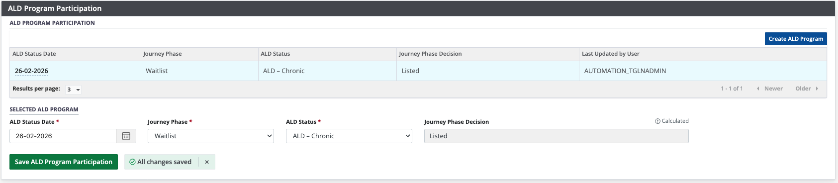 The system determines the Journey Phase Decision and updates automatically upon saving the ALD Program Participation data. The new ALD program participation information will be displayed in the ALD Program Participation table.