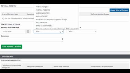 Once a recipient’s transplant journey is initiated and the referral details are saved, a referral decision must be logged.